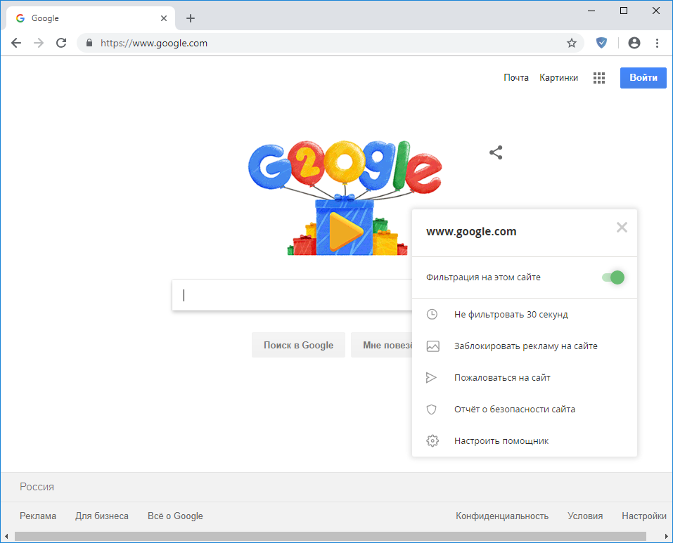 С Помощником вы можете выбирать, блокировать ли рекламу на сайте, останавливать фильтрацию на 30 секунд, проверять сайт на безопасность и/или отправлять жалобу на сайт (например, на пропущенную рекламу).