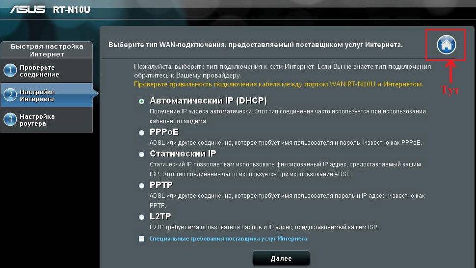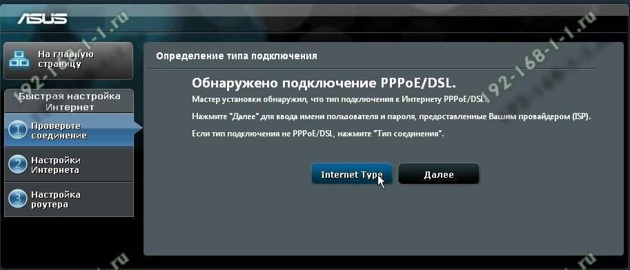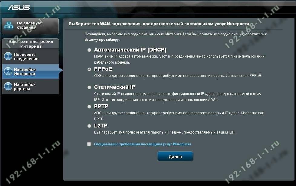 Чаще всего используется либо «Автоматический IP(DHCP)» и «PPPoE». В первом случае, обычно, ничего дополнительно указывать не надо, а вот во втором — надо будет ввести логин и пароль на подключение, которые Вам выдали при заключении договора с провайдером. Нажимаем на «Далее».