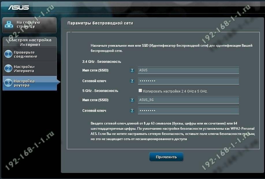 Здесь надо будет прописать имя сети SSID и пароль для неё — Сетевой ключ. В случае, когда Вы настраиваете двухдиапазонный маршрутизатор, то здесь надо будет ввести название и пароль WiFi для диапазона 5GHz. Жмём на кнопку «Применить».