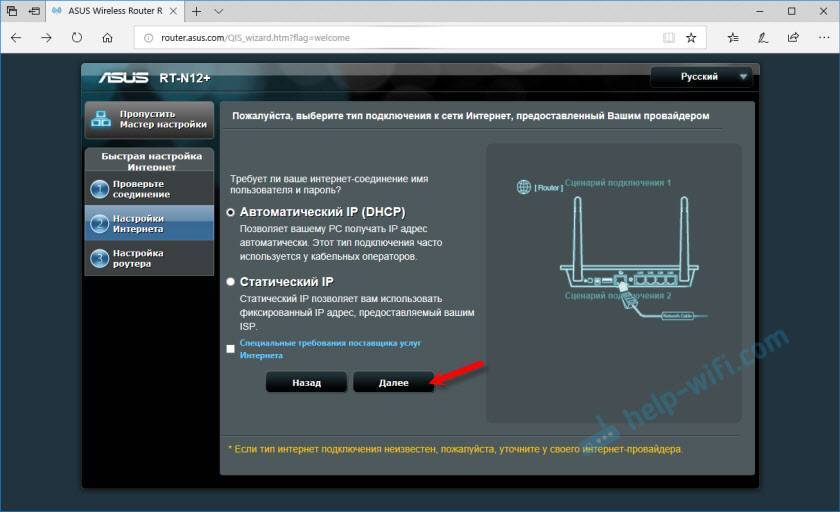 Тип подключения к интернету можно уточнить у поддержки своего интернет-провайдера. Выберите свой вариант и нажмите “Далее”.