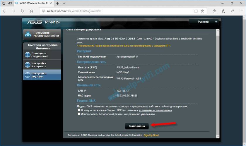 После запуска Asus RT-N12 выйдет в интернет с указанными настройками.
