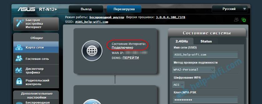 Если Asus RT-N12E не может подключится к интернету, то он будет раздавать Wi-Fi сеть без доступа к интернету. Я уже писал об этой проблеме: роутер Asus не раздает интернет по Wi-Fi сети. Проверьте все параметры в разделе “Интернет”. Уточните настройки у провайдера. Возможно, ваш провайдер делает еще привязку по MAC-адресу. И нужно клонировать MAC-адрес, или прописать новый у провайдера.