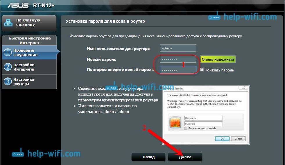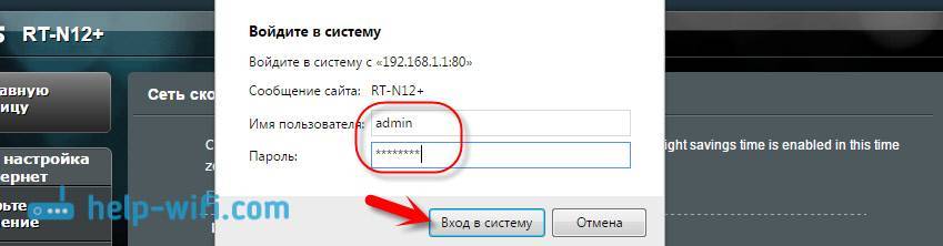 В окне для ввода имени пользователя и пароля по умолчанию Asus Rt N12 вводится “admin” потом их можно будет сменить.