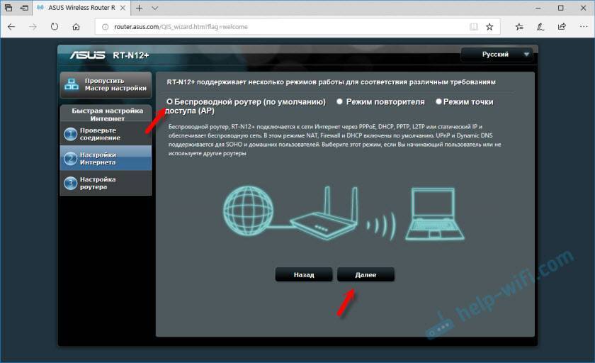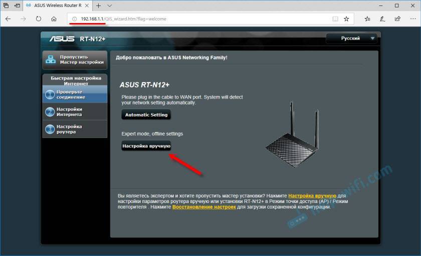Должен появится мастер быстрой настройки (у меня модель RT-N12+, не обращайте внимания). Чтобы начать настройку с помощью мастера быстрой настройки нажмите на кнопку “Настройка вручную”. Следуя подробным инструкциям можно полностью настроить свой маршрутизатор. Это как один из вариантов настройки.