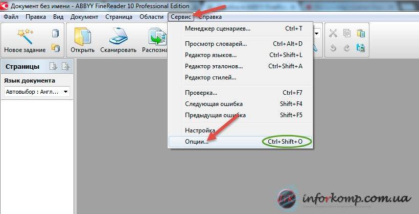 На самом деле, исправить такую ошибку очень легко. Для начала, открываем окошко ABBYY FineReader и наведя мышку на панель меню нажимаем на «Сервис » -> «Опции. ». Так же, можно воспользоваться сочетание клавиш «Cntr+Shift+O », которое отвечает за экспресс открытие окна настроек.