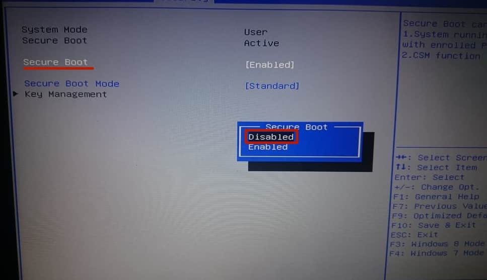 - Напротив строчки Secure Boot выставьте значение Disabled.