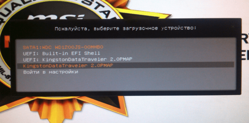 - Выбрать в качестве загрузочного устройства флешку.