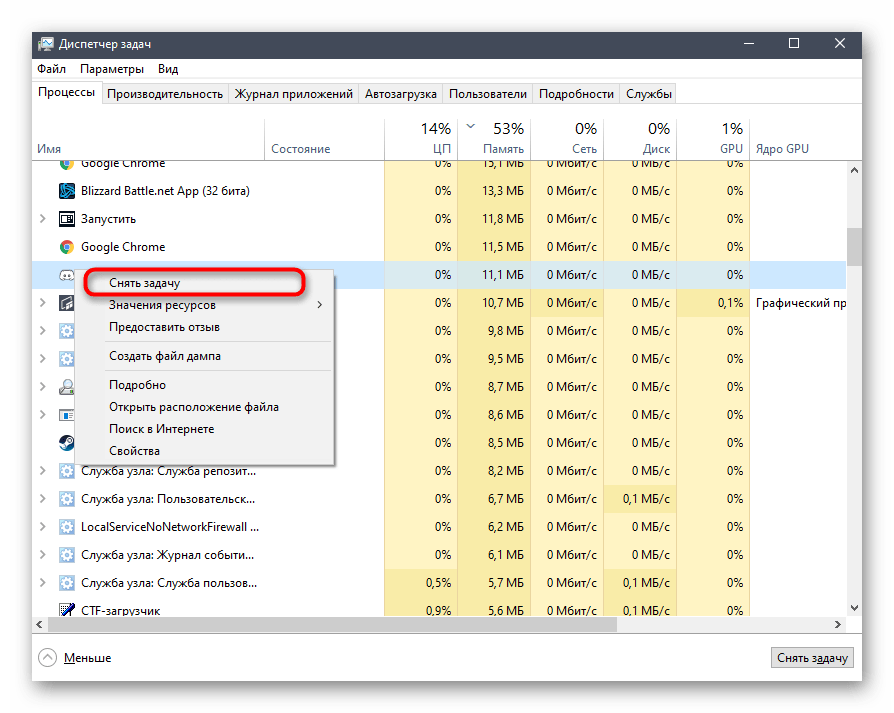 Появится контекстное меню, в котором необходимо выбрать первый пункт — «Снять задачу». Сделайте то же самое со всеми процессами Дискорда, если найдете их в этой вкладке.
