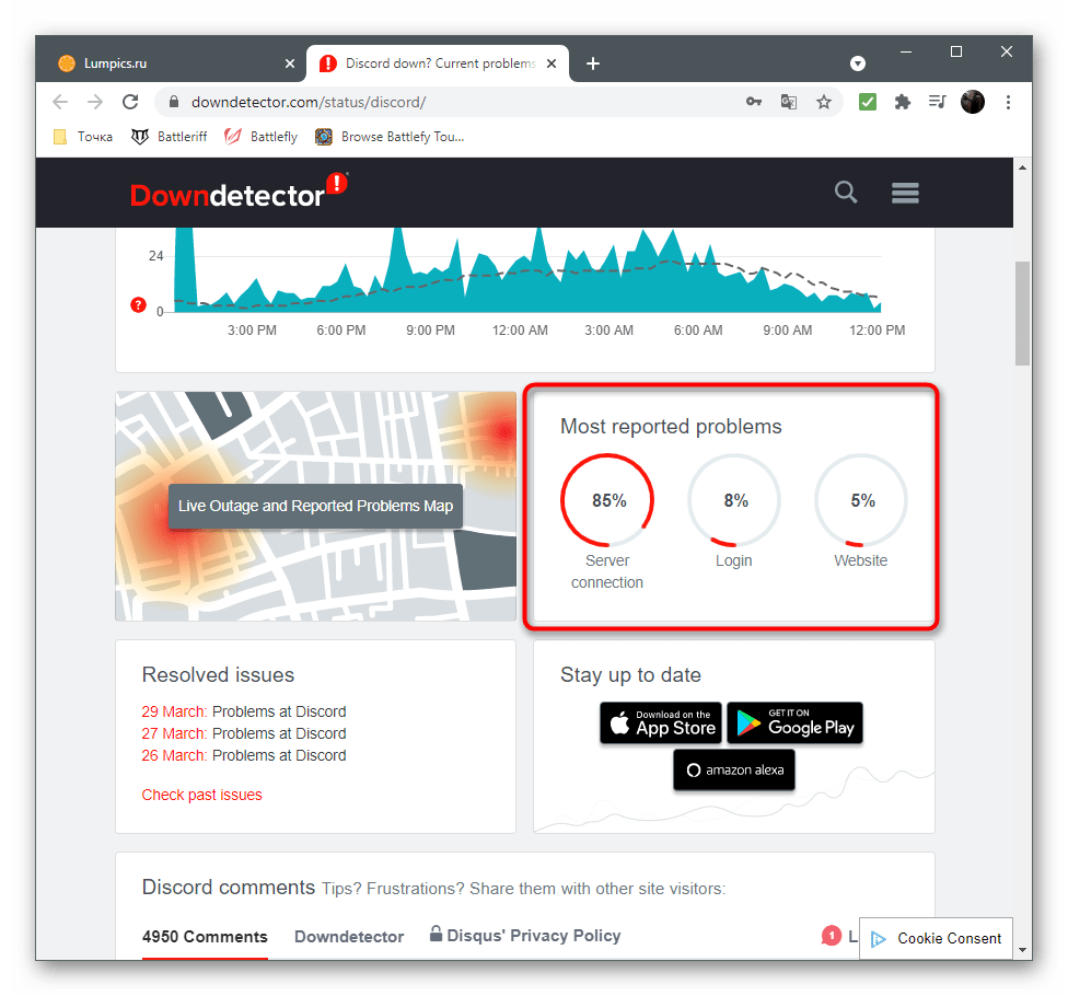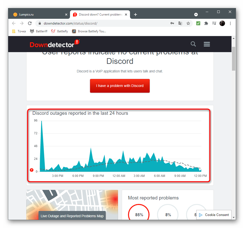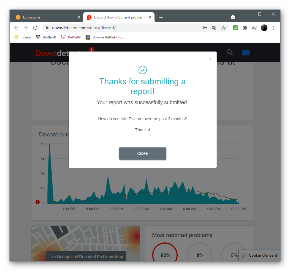 Воспользуйтесь ссылкой ниже, чтобы перейти на сайт Discord Downdetector, где нажмите кнопку, чтобы сообщить о возникшей проблеме при установке Discord.