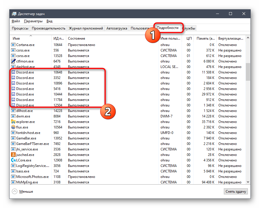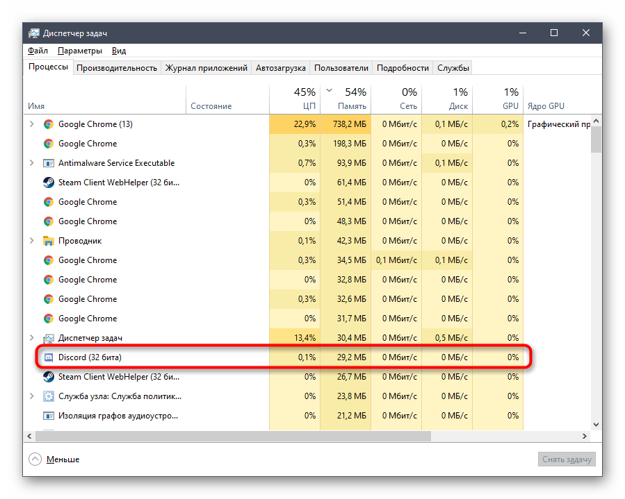 Инсталляция Дискорда нередко прерывается из-за наличия дополнительных запущенных процессов, в том числе и открытой веб-версии в браузере. Если с ней все понятно — нужно закрыть сам сайт, то вот процессы в операционной системе придется отыскать и завершить вручную, что происходит так: