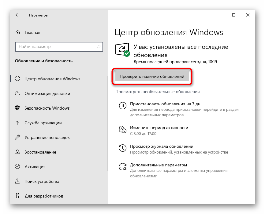 Вы окажетесь в категории «Центр обновления Windows», где необходимо нажать кнопку «Проверить наличие обновлений». Дождитесь окончания поиска и подтвердите их установку, если те будут найдены.