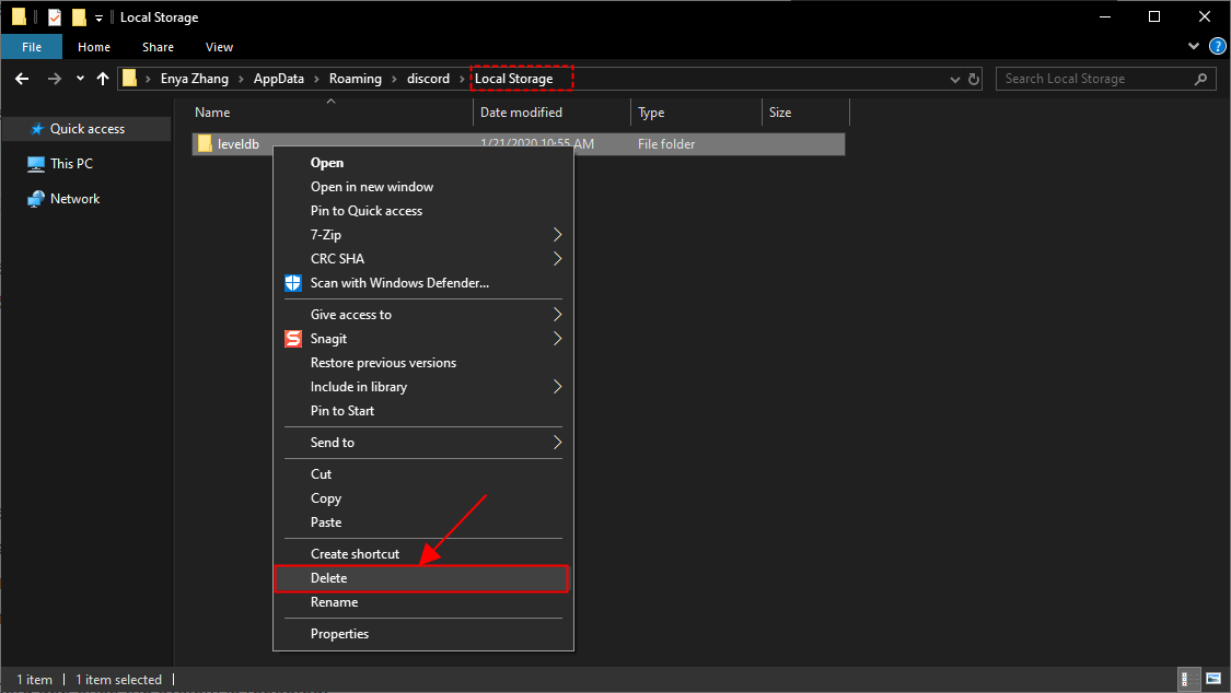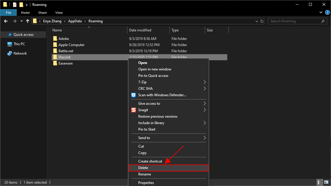 4) Щелкните правой кнопкой мыши Раздор папку и удалите ее.