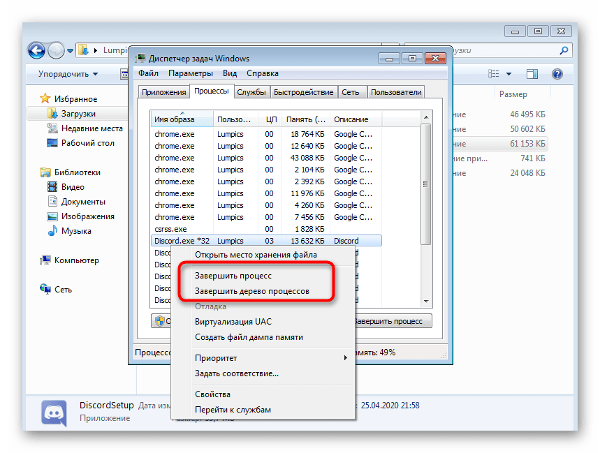 Если из-за сбоя сети, записи файлов или других причин первая установка Discord завершилась неудачно, и вы запускаете новую, возможно, во время нее на экране тоже появится ошибка или даже не откроется окно инсталлятора. Происходит подобное потому, что сейчас фоном функционируют процессы программного обеспечения, мешающие обновлению данных. Проверьте их и закройте при наличии, воспользовавшись Диспетчером задач.