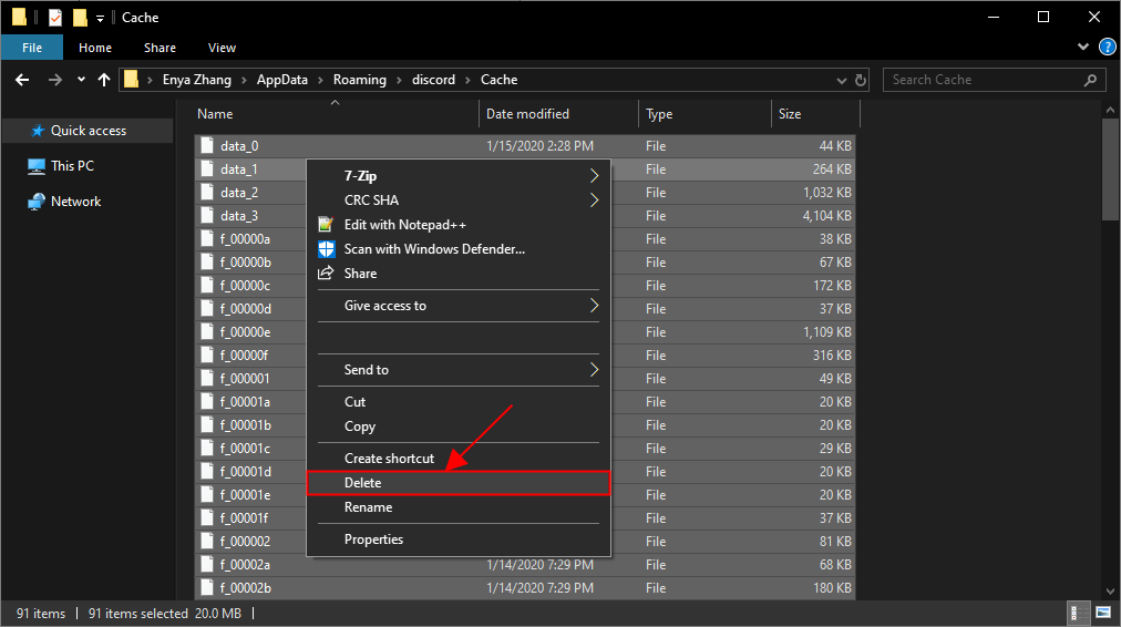 3) В папке Cache нажмите Ctrl и К в то же время выбрать все файлы, затем щелкните правой кнопкой мыши и выберите удалять .