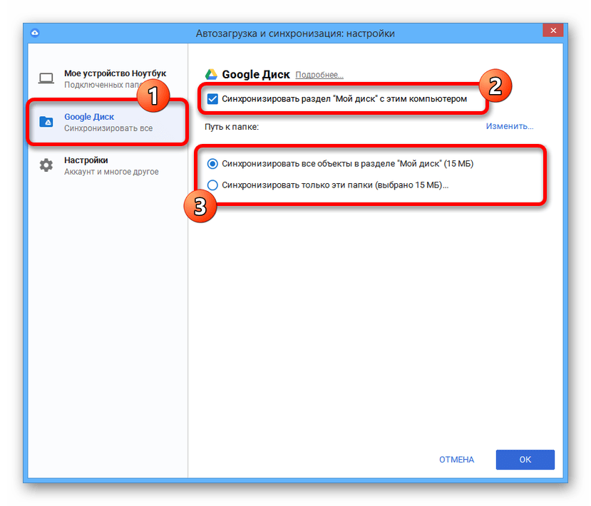 Через меню в левой части окна откройте вкладку «Google Диск» и установите галочку «Синхронизировать раздел Мой Диск с этим компьютером». Также не забывайте про вспомогательные настройки.