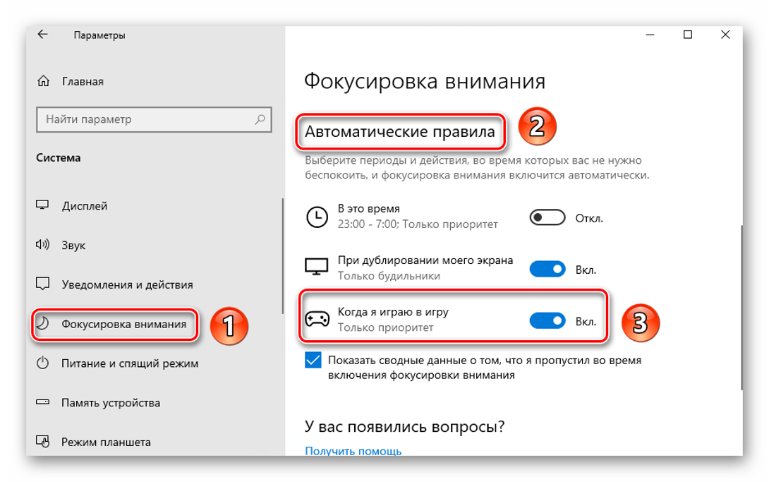 Не спешите после этого закрывать окно. Вам нужно будет дополнительно перейти в подраздел «Фокусировка внимания». Затем найдите в нем область под названием «Автоматические правила». Переключите параметр «Когда я играю в игру» в положение «Вкл». Это действие даст понять системе, что вас не нужно беспокоить докучливыми уведомлениями во время игры.