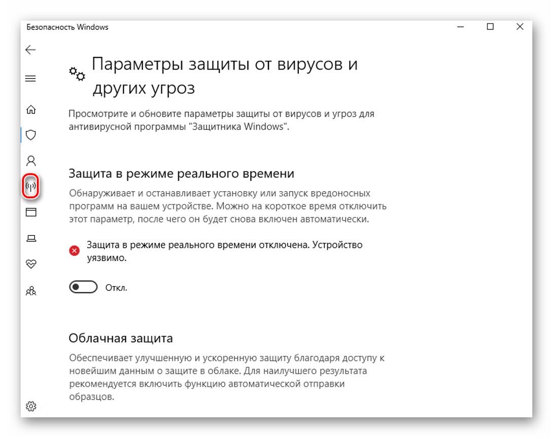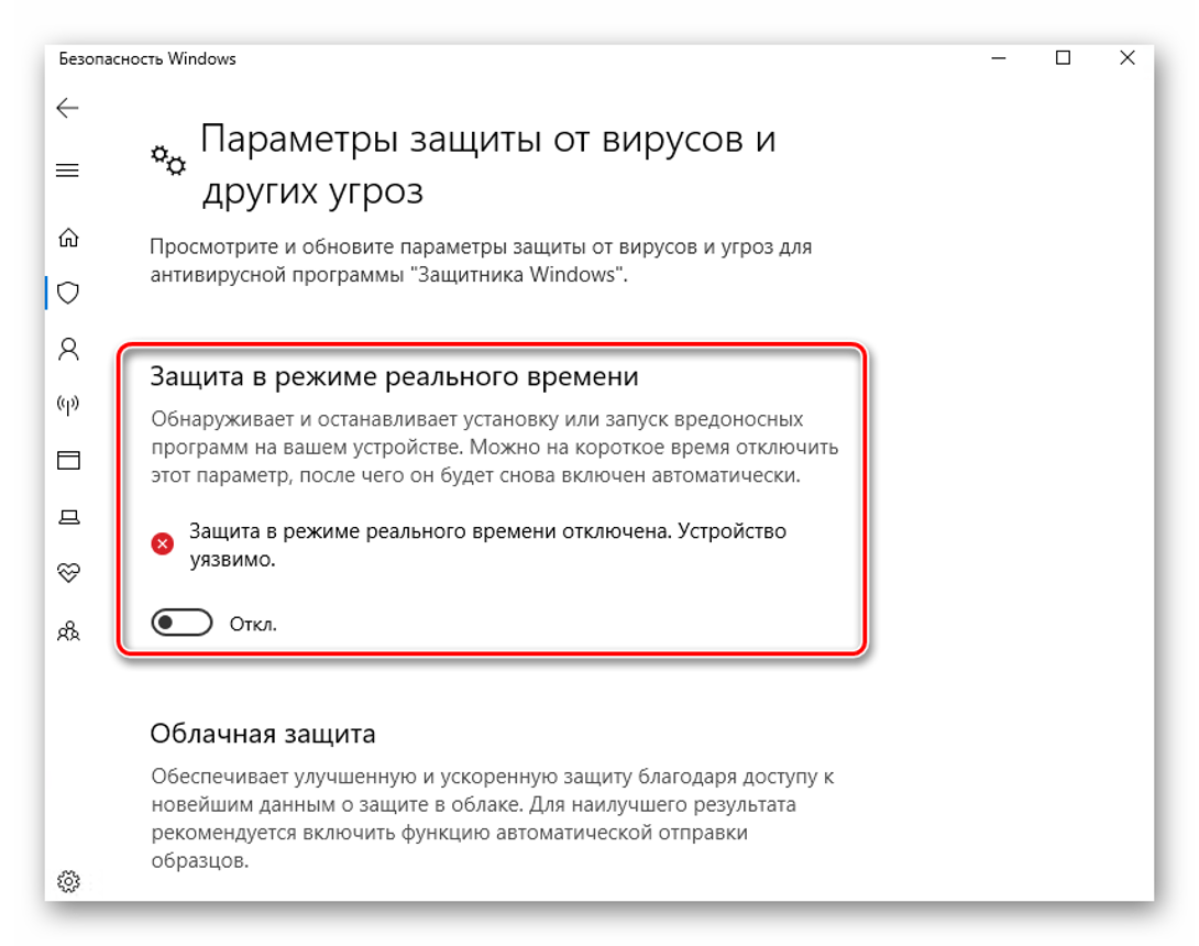В «Защите в режиме реального времени» передвинуть тумблер в значение «Выкл.».