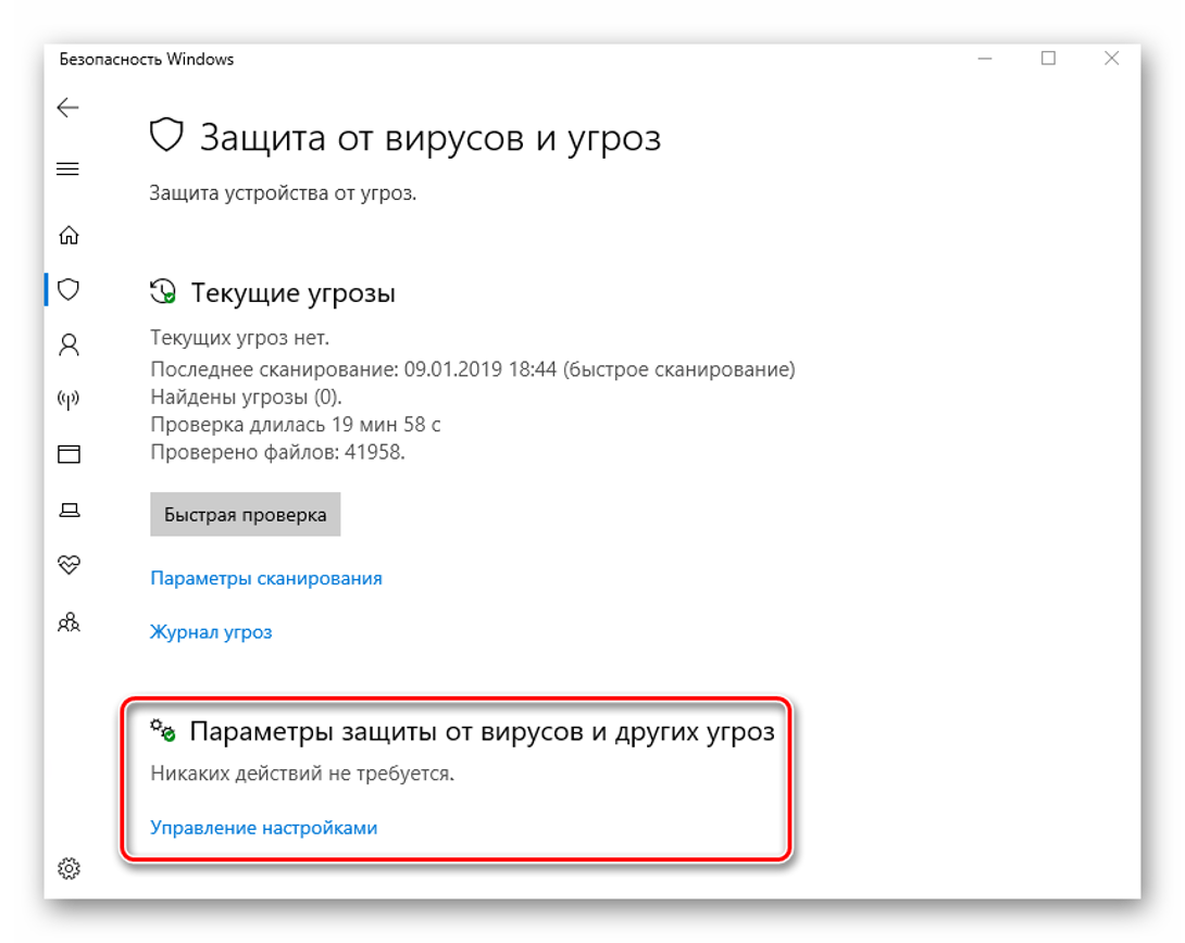 Кликнуть «Управление настройками» под надписью «Параметры защиты от вирусов и других угроз».