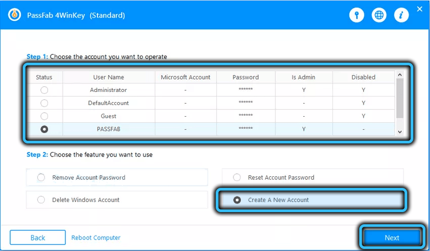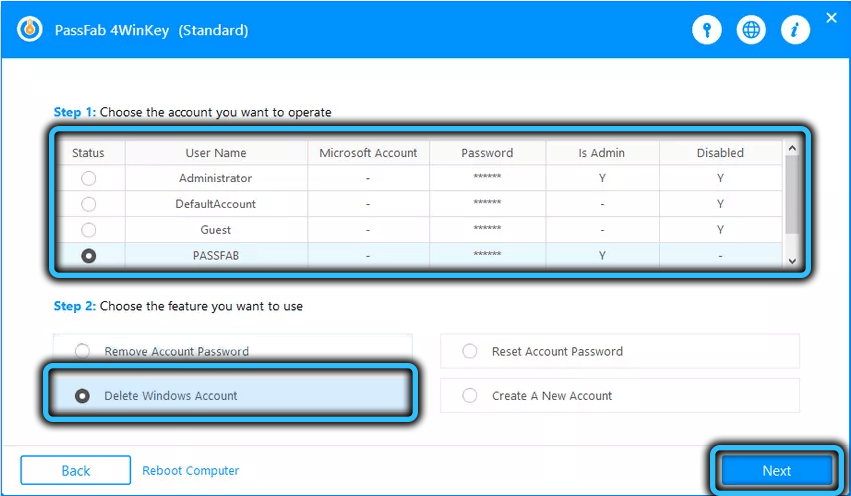 Если требуется удалить учётную запись пользователя или администратора (например, если сбросить пароль не удалось из-за отсутствия полномочий), делаем те же шаги до появления основной заставки программы PassFab 4WinKey. В нижнем блоке выбираем опцию «Удалить» (Delete Windows account) или «Создать» (Create a New account) учётную запись пользователя.