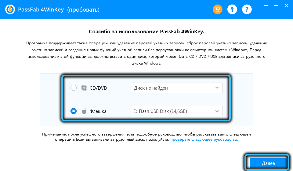 Если ваш компьютер заблокирован, установите программу на любой другой ПК, первый шаг в этом случае останется тем же – создание загрузочного накопителя. Вам нужно только указать его тип – USB-носитель или оптический диск.