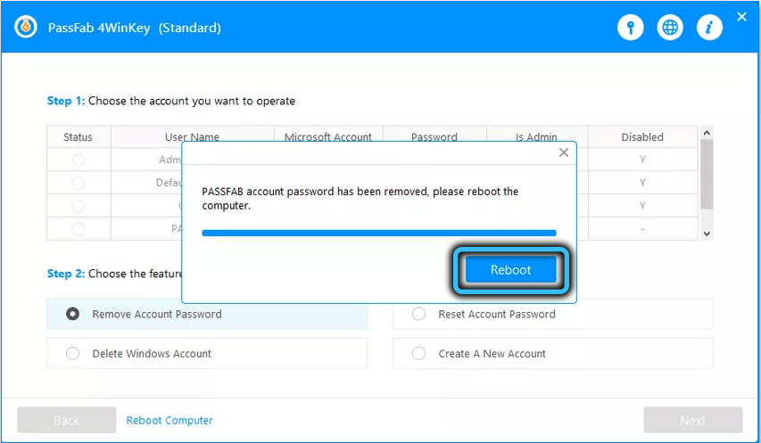Появится основной экран 4WinKey, на котором в верхнем блоке будет таблица, включающая о пользователях системы, в том числе и с правами администратора. Выбираем аккаунт, с которым хотим работать, а затем внизу выбираем нужное действие: удалить (Remove Account password) или сбросить (Reset Account password) пароль. Жмём кнопку «Далее» и дожидаемся окончания процедуры. Перезагружаем ПК и вводим новый пароль.