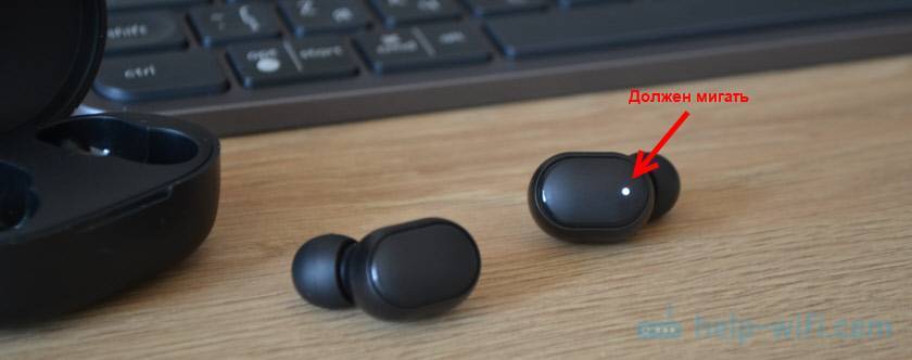 Как происходит синхронизация наушников AirDots: достаем их из кейса или включаем вручную и на обеих наушниках активно мигает индикатор. После чего на левом наушнике индикатор гаснет, а на правом продолжает медленно мигать. Это значит, что наушники соединились и готовы к подключению.