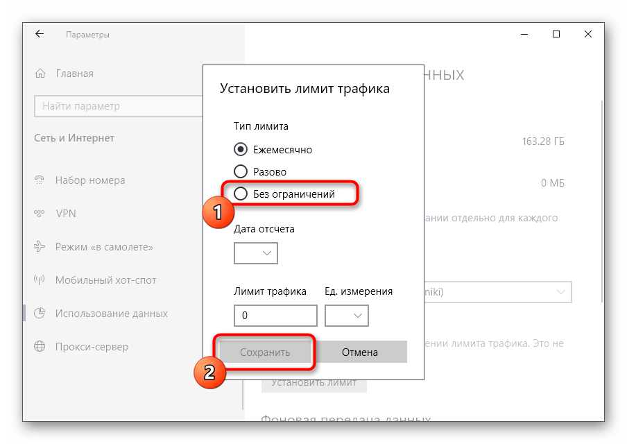 Иногда операционная система в автоматическом режиме устанавливает лимитные подключения, например, если тарифный план используемого интернета ограничен. Если Виндовс посчитает, что лимит вот-вот кончится, скачивание приложений будет запрещено. В случае, когда вы уверены в том, что эту опцию можно отключить или вообще не нуждаетесь в ней, выполните такие действия:
