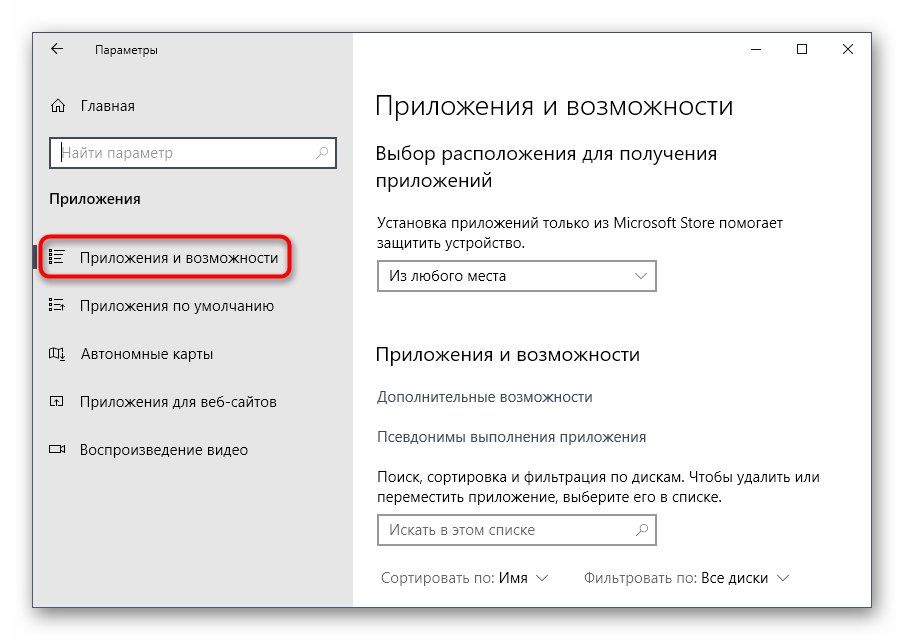 Через категорию «Приложения и возможности» опускайтесь вниз списка, чтобы отыскать там Microsoft Store.