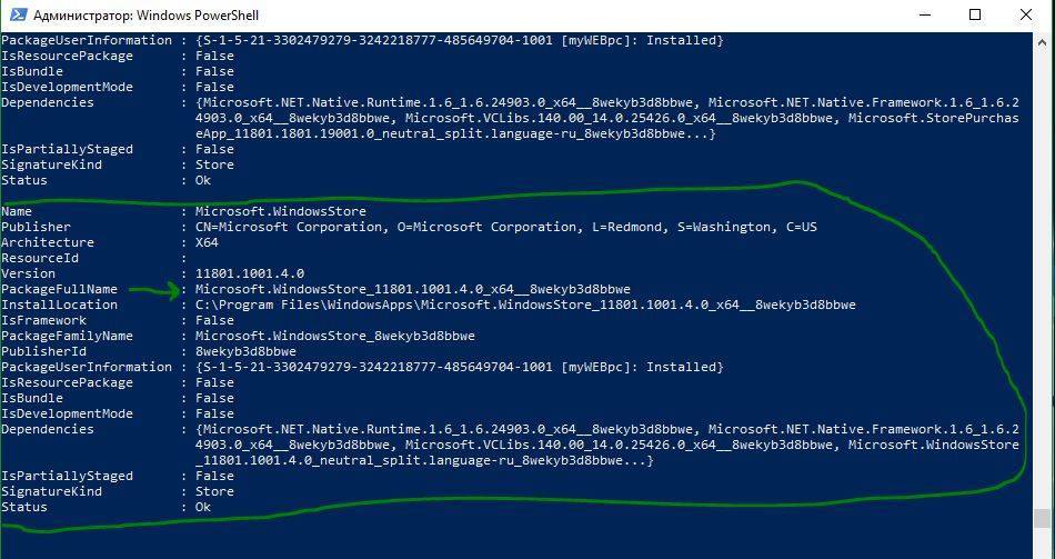 Если по каким-то причинам комбинация не помогла установить магазин, то возвращаются в PowerShell и вводят другую команду («Get-AppxPackage -AllUsers | Select Name, PackageFullName»). После ее выполнения на экран будет выведен список всех доступных приложений магазина. Необходимо найти строчку «Microsoft.WindowsStore» и скопировать ее полное имя, находящееся справа. Остается выполнить последнюю команду «Add-AppxPackage -DisableDevelopmentMode -Register „C:\Program Files\WindowsAPPS\полное_имя\AppxManifest.xml“».