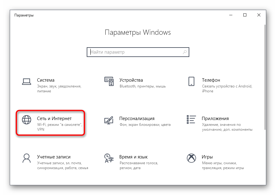 - В том же меню «Параметры» зайдите в раздел «Сеть и Интернет».