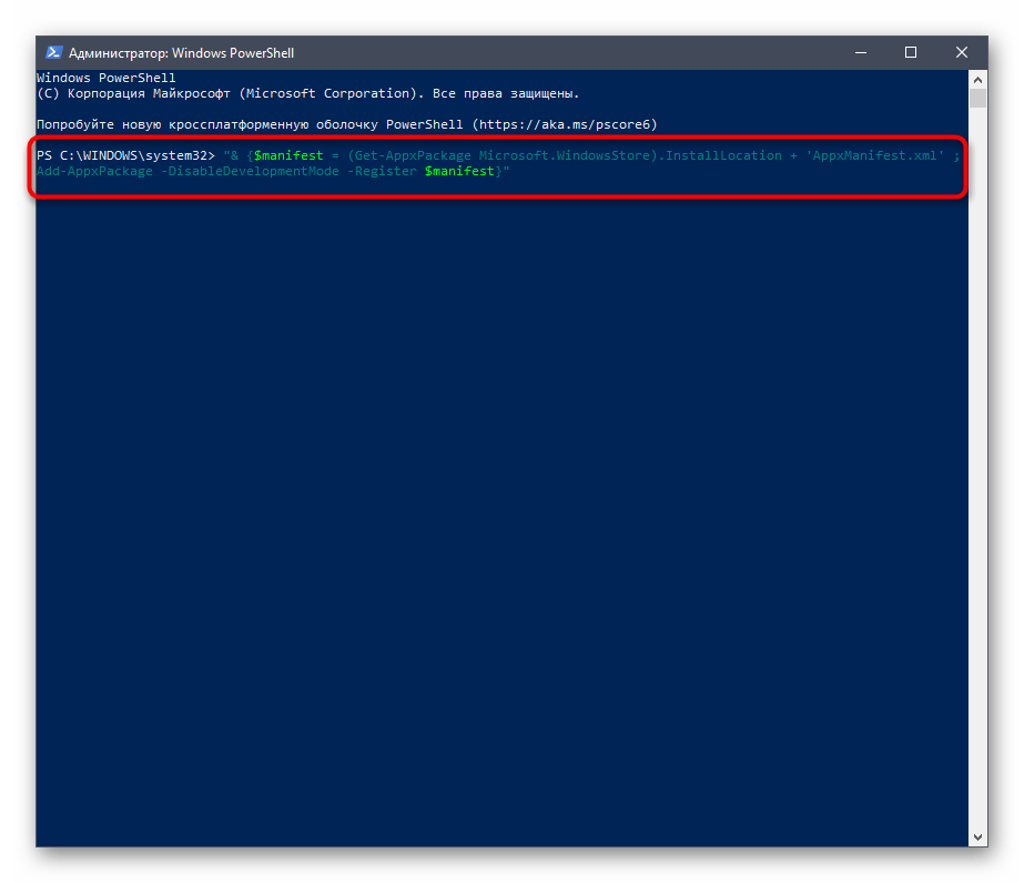 - Дожидаются запуска PowerShell и прописывают (копируют) команду «Get-AppxPackage *windowsstore* -AllUsers | Foreach {Add-AppxPackage -DisableDevelopmentMode -Register „$($_.InstallLocation)\AppxManifest.xml“}» без кавычек. Внутренние кавычки можно ввести самостоятельно, если программа их удаляет или не видит.