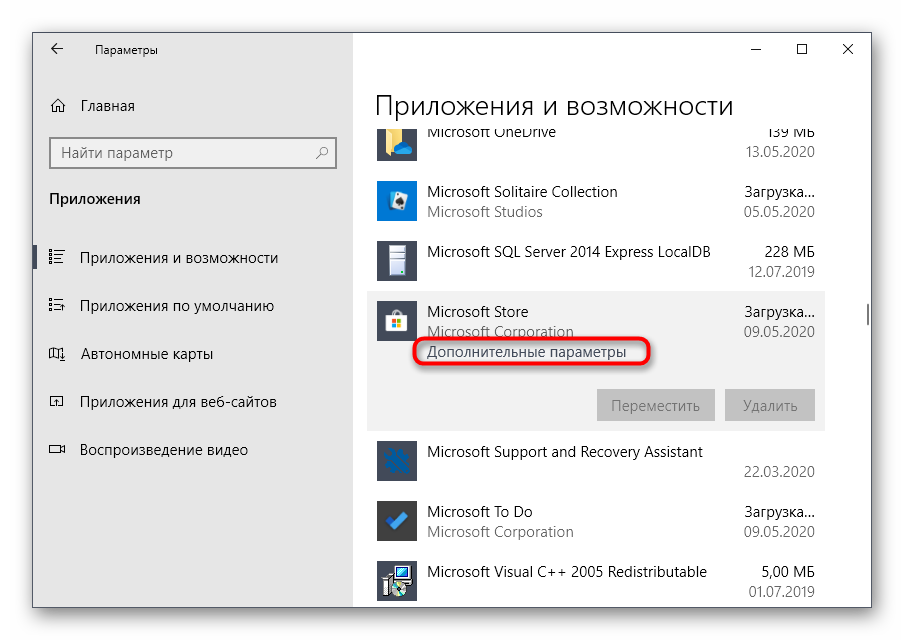 Выберите приложение левой кнопкой мыши и щелкните по кликабельной надписи «Дополнительные параметры».