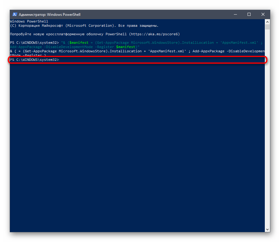 Через несколько секунд должна отобразиться новая строка ввода без ошибок, а это значит, что регистрация прошла успешно. Перезагрузите компьютер и пробуйте загрузить приложения.
