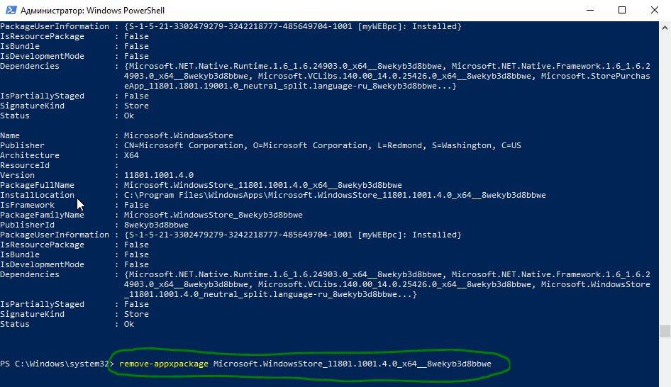 В новой строке PowerShell введите remove-appxpackage затем пробел и код, который вы скопировали в буфер обмена. У меня получилось примерно так, но у вас может отличаться в зависимости от версии самого приложения. Нажмите Enter и приложение microsoft store исчезнет, после чего перезагрузите компьютер.
