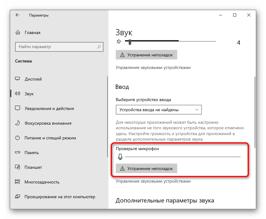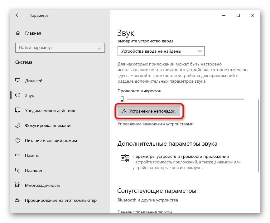 В этой категории найдите микрофон и нажмите находящуюся под ним кнопку «Устранение неполадок».
