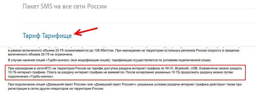 Проблема еще в том, что большинство операторов не указывают в описании тарифов правила использования интернет-трафика. Можно его раздавать на другие устройства, или нет – непонятно. Эта информация обычно указана мелким шрифтом в прикрепленном PDF файле, которые практически никто не читает. Вот для примера, как эта информация указана в подробном описании тарифа “Тарифище” от МТС: