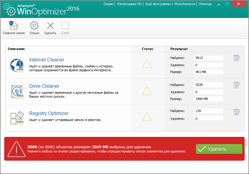 Однако, в этом случае компонент оставляет после себя различные хвосты, включая записи системного реестра. Поэтому используем дополнительную программу для очистки ненужных файлов Ashampoo WinOptimizer. Запускаем автоматическую проверку в один клик.