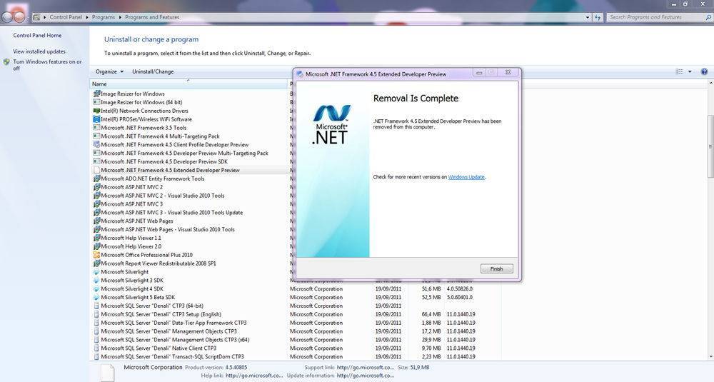 В Windows 7 можно даже удалить Microsoft Net Framework 4 по всем правилам, но и это не поможет избавиться от возникшей проблемы.