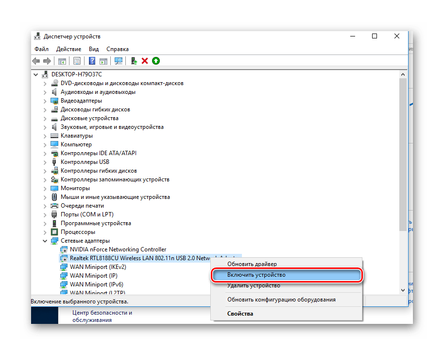 Чтобы задействовать адаптер, достаточно с помощью ПКМ вызвать контекстное меню и выбрать там пункт «Включить устройство».