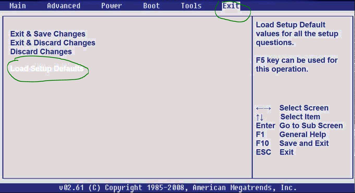 - Войдите в меню EXIT и жмите на Load Defaults для сброса настроек к заводским.