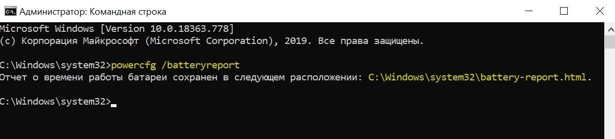 Вы также можете диагностировать программным путем эффективность аккумулятора ноутбука. Запустите для этого командную строку от имени администратора и введите команду: