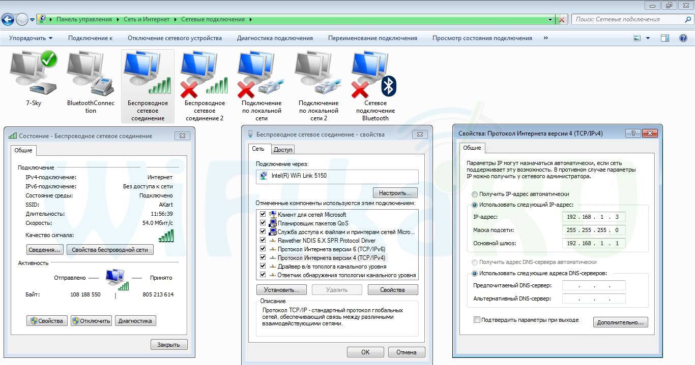 И смотрим наш адрес. У меня как раз указан неправильный, не из того диапазона, поэтому я задам для него, допустим, 192.168.0.159. Если же у вас все верно, адрес в том же диапазоне и не идентичен роутеровскому, а конфликт IP адресов в сети остается, значит какому-то компьютеру уже задан ваш адрес. Нужно просто поменять цифры в последнем окошке. Также не забудьте в качестве шлюза и DNS-сервера IP адрес самого роутера, чего не сделано на вышепредставленном скриншоте.