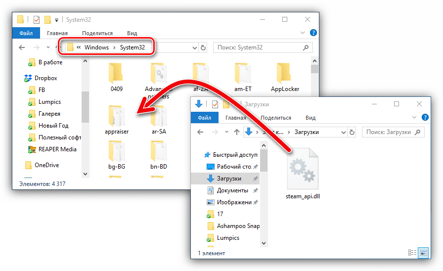 Если вы хотите устранить ошибку без помощи дополнительных программ, то это можно сделать, загрузив steam_api.dll на ПК и переместив файл в системную папку. На , она располагается по следующему пути: