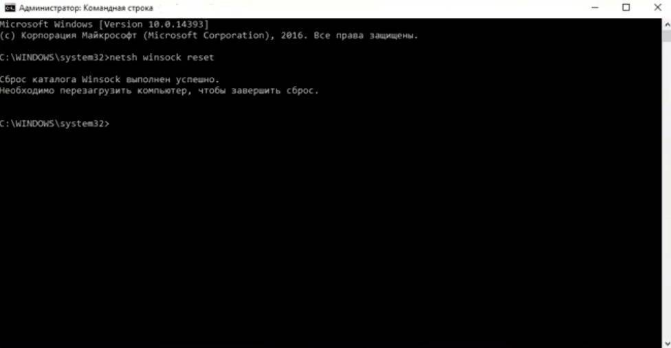- сброс сетевых настроек с помощью консоли командной строки, открытой с правами администратора, и команды «netsh winsock reset»;