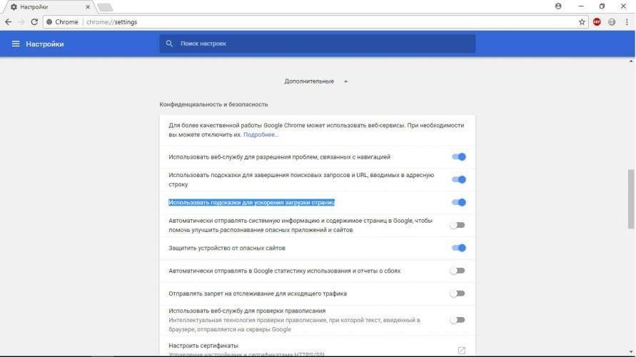 отключите функцию «Использовать подсказки для ускорения загрузки страниц»;