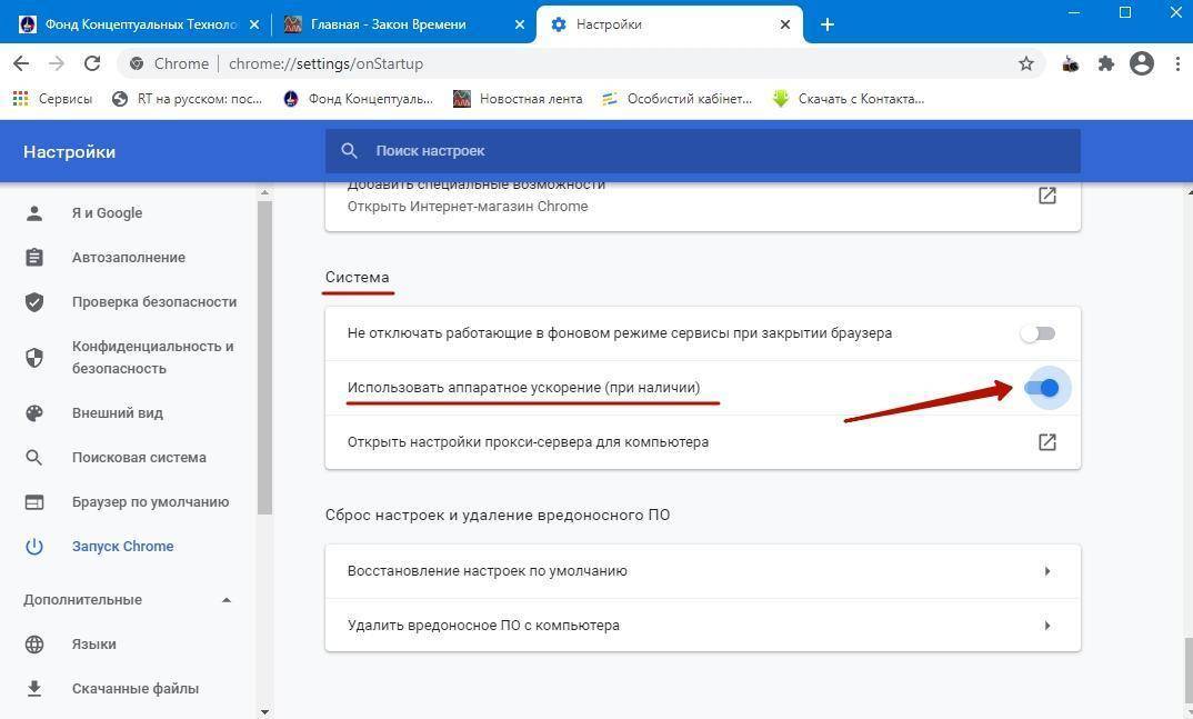 Шаг 3. Найти блок «Система», прокручивая страницу вниз с помощью колесика мыши, сдвинуть (отключить) ползунок или снять флажок с пункта «Использовать аппаратное ускорение (при наличии)».