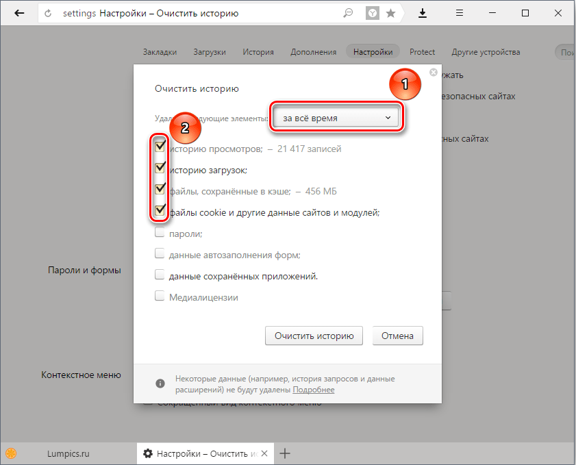 Немаловажную роль играет и захламленность самого веб-обозревателя: расширения, забитый кэш, куки и прочее. Все это отрицательно влияет на производительность программы. И потому она начинает плохо работать.