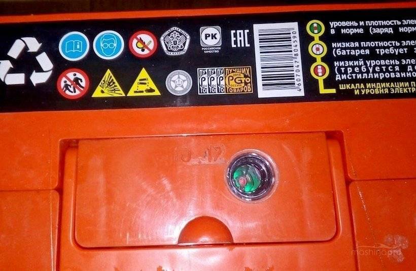 делать по цветному индикатору, вмонтированному в верхнюю панель некоторых АКБ: