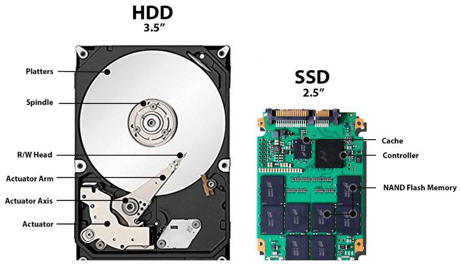 Основная разница между жёсткими дисками (hard disk drive) и твердотельными накопителями (solid-state drive) в том, что: