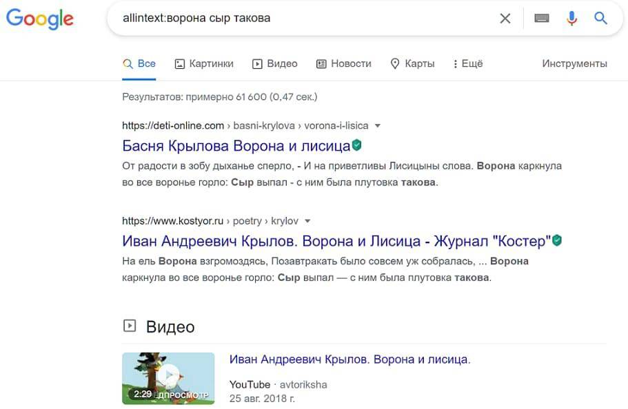 Если вы хотите найти текст, из которого помните всего несколько слов, воспользуйтесь командой allintext:. Поисковик покажет страницы, где есть все указанные слова.